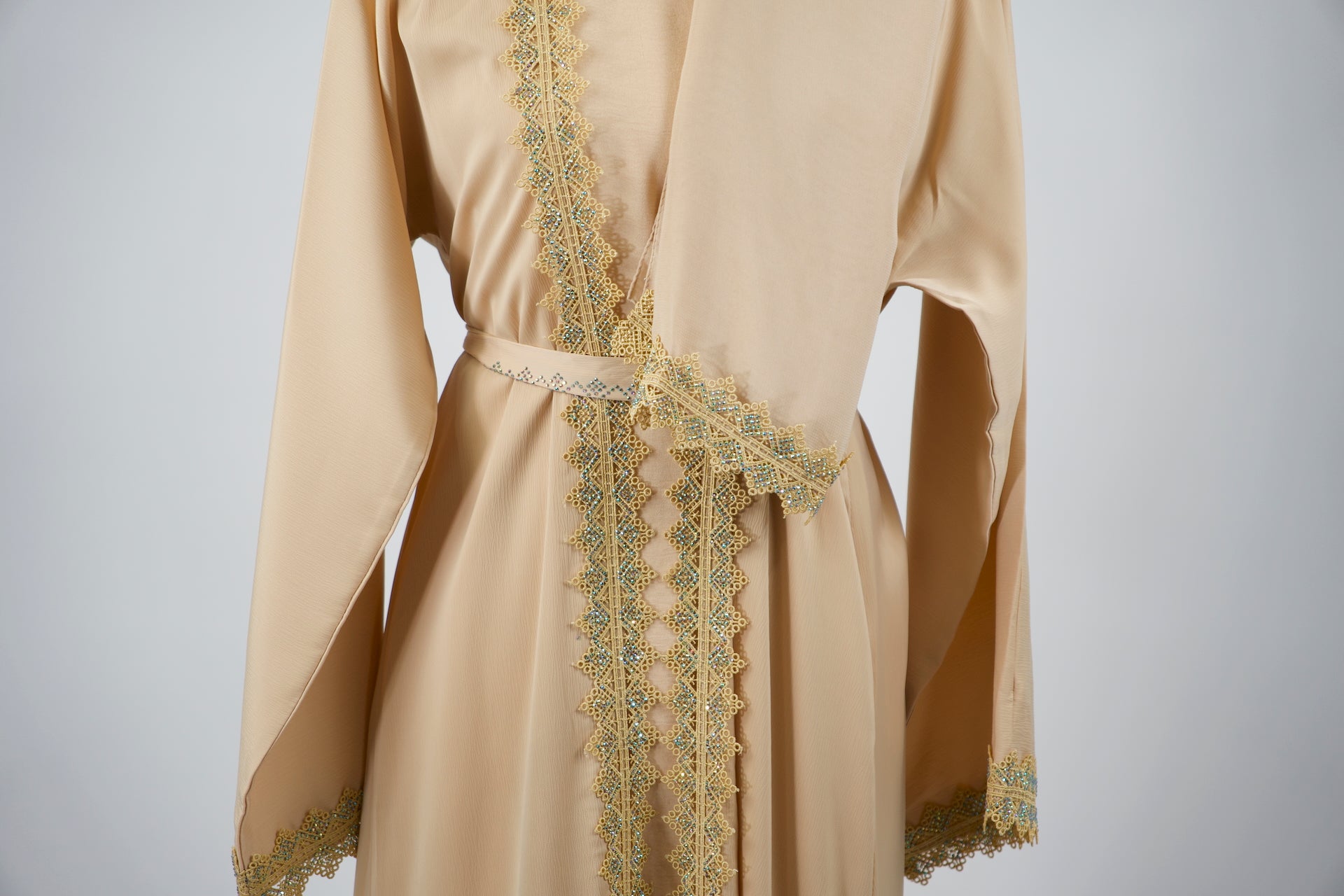 Introducing Goldish Sand Open Abaya & Dress Four-Piece Set. This abaya offers a sophisticated blend of traditional design and modern refinement. Detailed with delicate embroidery, each piece showcases expert craftsmanship and provides an elegant, breathable layering option. Perfect for formal events or refined daily wear, the set ensures a graceful fit that enhances your overall look while maintaining comfort and style.